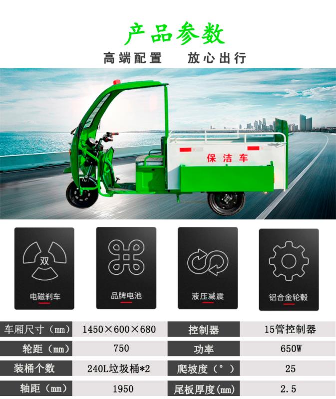產(chǎn)品簡(jiǎn)介:電動(dòng)三輪雙桶車,整車采用流線設(shè)計(jì),可同時(shí)裝載2個(gè)240L垃圾桶,整車操作簡(jiǎn)單,車廂尺寸:1450*600*680mm;東岳輪胎:前14*3.0 后16*3.0;控制器:15管控制器;